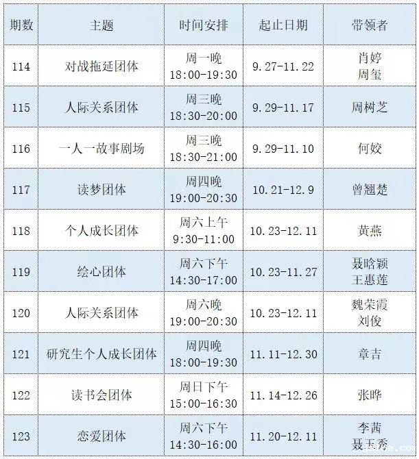 2.“光合作用”连续团体本学期分为三波,第一波团体114-116期,第二波团体117-120期,第三波团体121-123期,招募时间分别为九月中旬、十月上旬和十月下旬,为保证你在团体中更好地获益,建议不要同时报名多期连续团体,请根据实际需求及时关注你最想参与的团体招募信息。