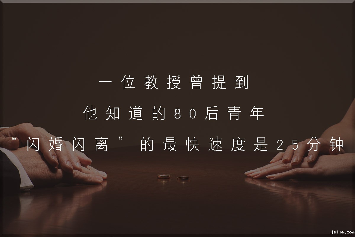 一个案例是这样的:一对80后在2008年11月1日认识,相识16天后结婚,然后不到一年又以缺乏了解为由申请离婚。另一位教授也曾提到,他知道的80 后青年“闪婚闪离”的最快速度是 25 分钟。