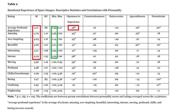 与大家的主观体验相一致,星空的图片确实能给人带来“惊叹”,“敬畏”,“美丽”等深刻的审美体验(见表中左侧的红框内,平均值都大于4)。但是值得注意的是,从图表中可以看出,有一些被试并没有产生很强烈的审美体验(见表中绿框内最小值),这是为什么呢?作者的一个有趣的发现就是,被试大五人格特质中的开放性(openness to experience)和她/他对星空图片产生的审美体验强度有非常高的相关性(相关系数r = 0.48,见表中右侧红框内)。也就是说,如果一个人越容易接受新事物,对事物好奇心越重,她/他看到星空时产生的诸如“惊叹”,“敬畏”等深刻的审美体验越强烈。那些对星空无感的人,基本上是开放性很低的人。