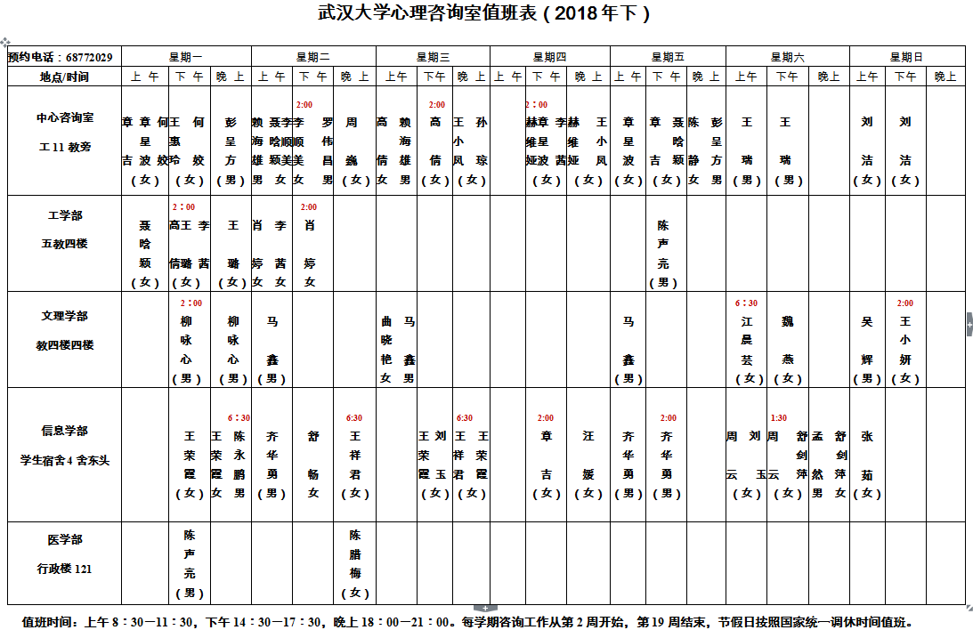 亲爱的同学们,心理中心本学期的咨询排班表出来啦。中心提供电话预约,有咨询需要的请拨打中心值班室电话,68772029进行预约。可与值班助管协商你倾向的咨询师、咨询时间和咨询地点。