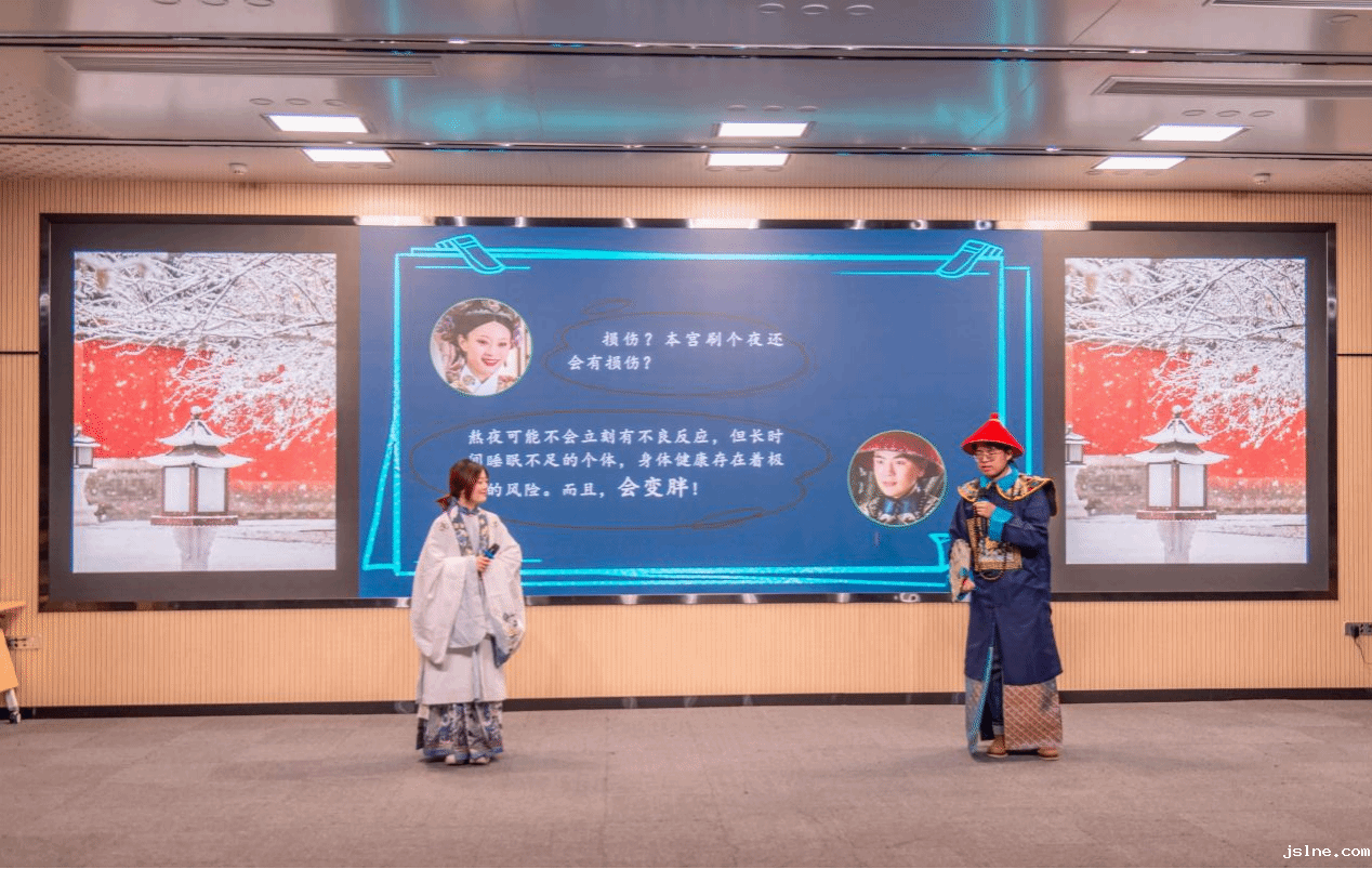 第二个上场的“来点酷酷帅帅狠队名队”关注的是大学生睡眠问题,从大学生睡眠问题产生的原因、危害、解决措施等方面展开知识讲授,中间巧妙的穿插“熹贵妃”与“温太医”的情景剧对话来解释熬夜可能的危害,诙谐风趣与科普结合,牢牢地抓住了观众的眼球,最后表达了希望大家都能拥有良好睡眠的愿景。