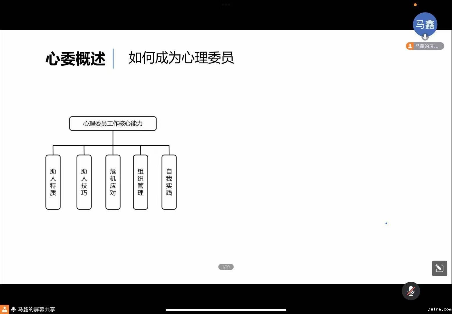 讲座之始,马老师向大家抛出一个令人深省问题:你为什么想要成为一名心理委员?同学们热情高涨,通过发弹幕积极与老师进行互动,踊跃回答,对于同学们的回答,马老师提出四点关键的益处:收获知识/技能、锻炼组织能力、助己--关注自身、助人--伟大工作。