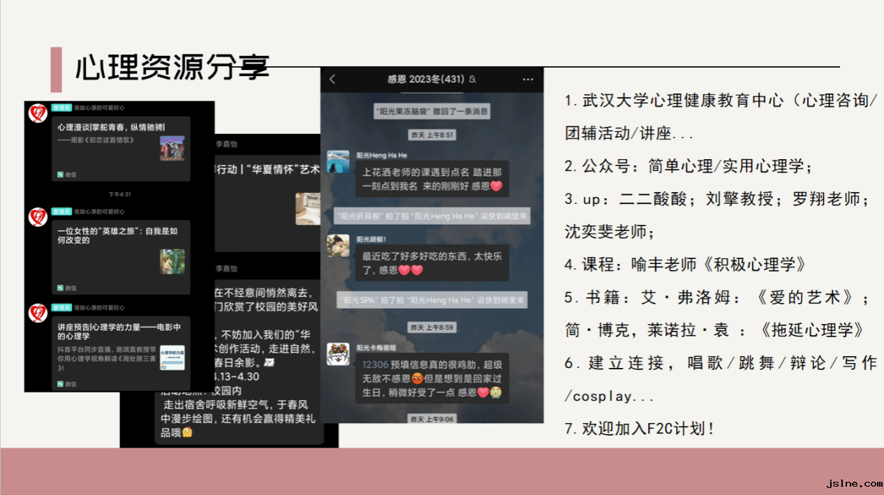 2.这次班会提供的心理资源很丰富,这样的交流机会让我受益很多!享受和大家团结在一起的瞬间!——刘美言