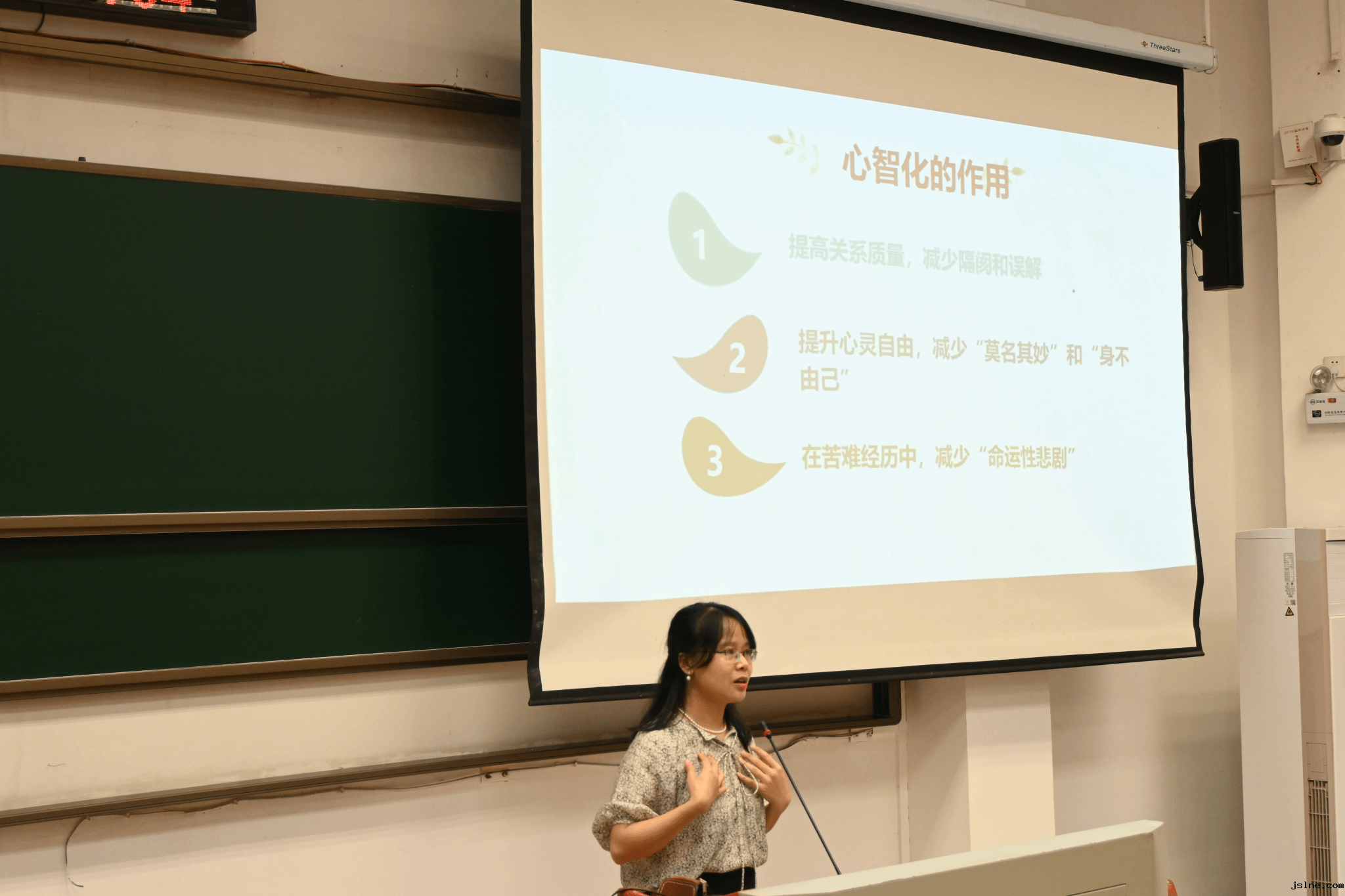 讲座伊始,何姣老师以生动的案例和幽默的语言,为同学们揭示了“心智化”这一复杂心理现象的本质。她指出,“心智化”即是我们根据他人的心理状态去解读其行为的能力,也是理解自我行为背后心理动机的关键。这种能力在我们的日常生活中发挥着至关重要的作用,它帮助我们更好地与他人沟通、理解彼此,从而建立和谐的人际关系。
